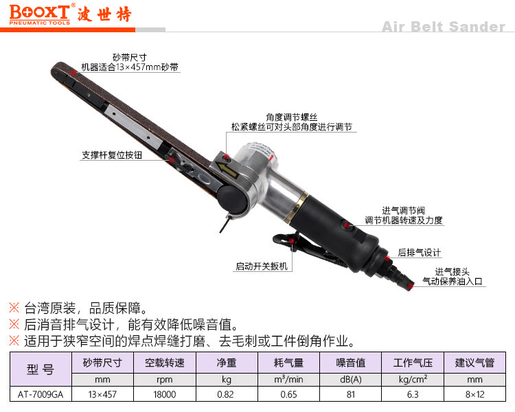 東莞市強勁五金工具有限公司提供臺灣BOOXT波世特品牌氣動工具,AT-7009GA圓手柄風動砂帶機廠家直銷,首件享特價。服務熱線:4008301980