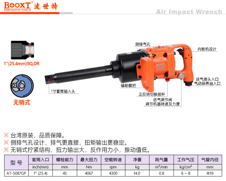 東莞市強勁五金工具有限公司提供臺灣BOOXT波世特品牌氣動工具,無銷式氣動風炮AT-5087GP廠家直銷,首件享特價。咨詢熱線:4008301980