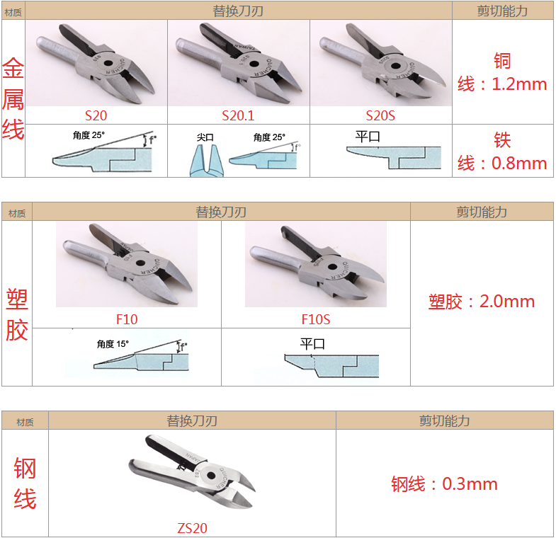 2.注意材質(zhì):材質(zhì)對(duì)選配刀刃非常重要,例如客戶要剪的銅鐵、材質(zhì)有鍍鈦、鍍烙、塑料材質(zhì)、加纖維超過(guò)20% 時(shí),一般刀刃不是剪不斷,就是使用壽命大大減少,塑料還容易在剪斷過(guò)程中碎裂。在這情形S刀刃應(yīng)選擇Z刀,塑料則建議使用電熱剪。